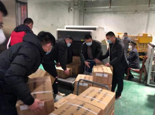 1月27至30日,同样是来自武汉的援助呼声,德州公司先后两次协助国控湖北提取疫情应急物资并转发铁路快运。每次历经赴郊外厂家提货装车、火车站搬货至专用车、平台搬货至平板车、安检搬运至传输带、传输带搬至站内小货车、办理托运手续……一箱箱沉甸甸的急救物资、一遍遍爱心接力传递,国控德州志愿队的同事们没有任何怨言。