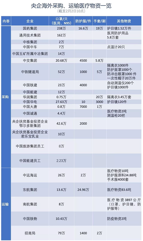截至2月2日10点,相关央企和央企员工共从海外采购口罩627.09万只,防护服18.45万件,手套51.1万副,医疗物资2吨,手术服、护目镜、防护面罩、帽子、点温计等31.2万套/件/个。