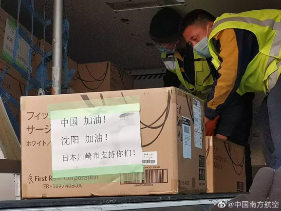 1月31日下午,南航CZ628东京-沈阳航班搭载日本川崎市捐赠的8万只医用口罩抵达沈阳。南航提供免费运输,并开辟绿色通道优先保障。