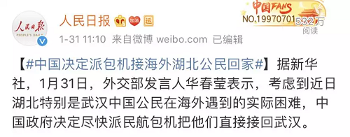 外交部发言人华春莹表示:考虑到近日湖北特别是武汉中国公民在海外遇到的实际困难,中国政府决定尽快派民航包机把他们直接接回武汉。