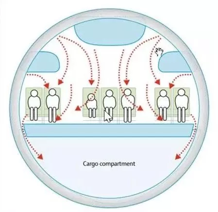 客舱内的空气来自飞机的客舱空气调节系统,包括两部分:机外由发动机引入的高温高压新鲜空气和再循环利用的客舱空气。正常情况下,客舱再循环空气占总引气量不足1/2,并且,再循环空气会经过气滤再进入客舱。