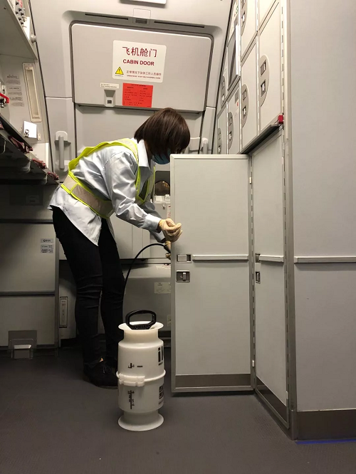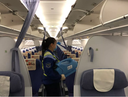 航后清洁:使用消毒剂擦拭客舱门周边、小桌板、扶手及洗手间等乘客接触较多的区域。每天航班运行结束后对飞机做预防性消毒。