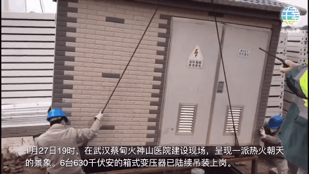 19时,火神山医院建设现场,国家电网6台630千伏安的箱式变压器已陆续吊装上岗。