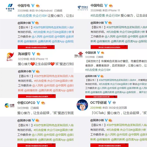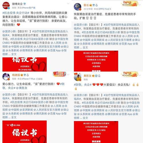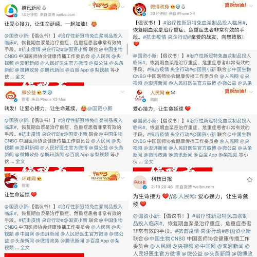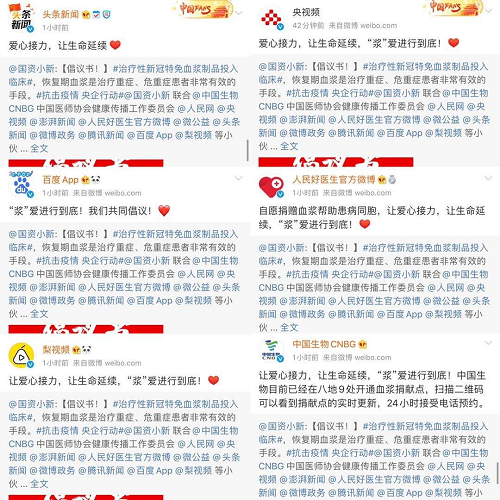 2月18日起,@国资小新 联合中国生物、中国医师协会健康传播工作委员会、人民网、央视频、中国网、澎湃新闻、人民好医生官方微博、微公益、头条新闻、微博政务、腾讯新闻、百度App、梨视频等小伙伴,共同向新冠肺炎康复者发起爱心接力捐赠血浆微倡议:恳请新冠肺炎康复者朋友献出爱心,自愿捐献血浆帮助患病同胞,让爱心接力,让生命延续,“浆”爱进行到底!