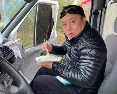 在车上吃盒饭的郭洪伟