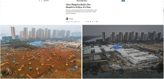英国广播公司(BBC)评论,武汉用10天的时间建立了一家新医院,专门收治新型冠状病毒肺炎患者,如此“超高速”不可想象。报道援引美国智库外交关系协会全球健康高级研究员黄严忠的话称,“中国在基建工程方面很擅长,也许这对西方人来说很难想象,但中国已屡次高效地建起摩天高楼”。美国《纽约时报》称,无人机拍摄的图像显示,卡车、挖掘机和工人们在火神山、雷神山医院工地全力作业,短短几天时间医院已初具雏形。