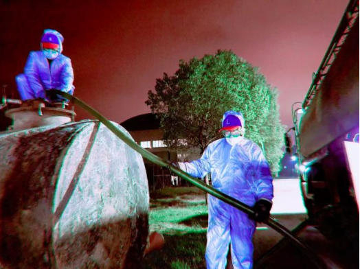 晚上7点,两支党员突击队先后抵达卸油点,将10000升柴油紧急驰援到黄陂一中体育馆方舱医院。