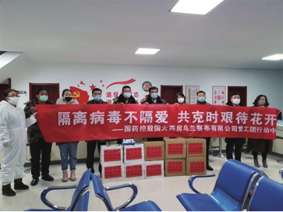 本报讯 近日,乌兰察布国大药房为集宁区新体路街道办事处工作人员捐赠了消毒液、防护手套等抗击疫情的物资。