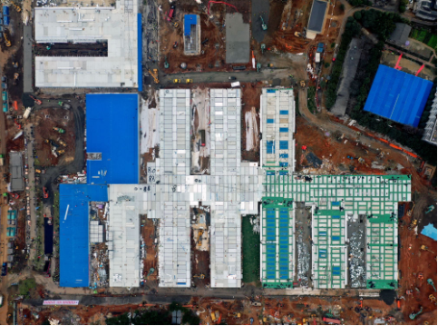 在武汉火神山、雷神山医院建设中,基于北斗卫星导航系统的高精度定位设备火速驰援,确保工地大部分放线测量一次完成。这是无人机拍摄的武汉火神山医院。记者李贺摄