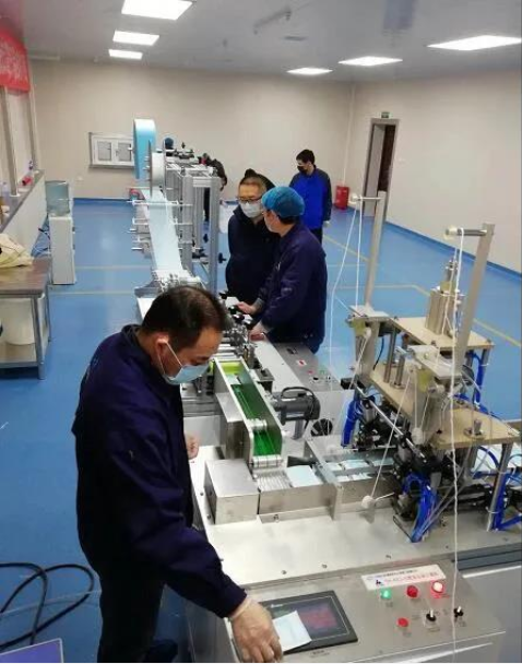中国石油党员突击队技术人员正在调试口罩生产线工艺