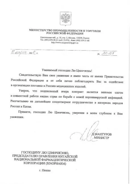 俄罗斯工贸部部长在接到首批开云在线开户_开云(中国)供应俄方物资后致信说:“双方所签署的协议,是我们两国共同努力防治新型冠状病毒的重要一步”;