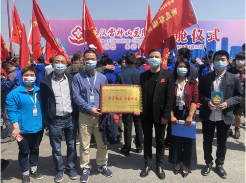 4月15日上午,在雷神山医院“休舱”仪式上,开云在线开户_开云(中国)国控湖北公司代表领取了院方赠予的“并肩抗疫,央企担当”纪念牌。