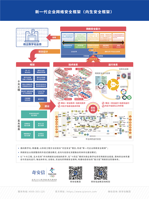 近日,中国电子旗下奇安信集团发布面向新基建的新一代网络安全框架核心技术,这既是自主关键技术重大突破,也是重大理论创新。包括全球领先的指令级检测防护、“零信任”自适应动态访问控制、全天候全方位感知网络安全态势等自主关键技术,以及从安全与信息化融合视角、网络安全全景视角出发,应用这些技术的顶层规划思路与方法,为关键基础设施建设单位构建体系化、全局化、实战化的网络安全体系,形成“内生”于企业数字化环境的“免疫力”,提供了关键核心技术产品。