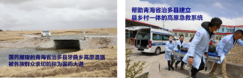 在治多,积极助力治多干部群众脱贫攻坚。为海拔4800米的索加乡捐建道路,助力藏区群众易地搬迁,解决“两不愁、三保障”上;捐赠两千余万元医疗设备以及高原救护车、NICU等,创建青海藏区首个县乡村高原急救系统“全覆盖”。在计划免疫和疾病预防上,为空白人群接种乙肝疫苗,实现了首个藏区县域乙肝免疫“全覆盖”;捐赠国内最先进筛查设备,实现首个藏区县域宫颈癌基因检测免费“全覆盖”。在扶贫扶志和技术帮扶上,基层干部培训实现乡镇和系统经济部门“全覆盖”,医疗技术人员培训实现县级医疗卫生机构“全覆盖”,并通过长期派驻医疗专家队,助力治多县妇幼保健院在青海藏区县级妇幼机构中首家通过二甲,医疗资源辐射整个玉树藏区,收到当地各族群众广泛赞誉。