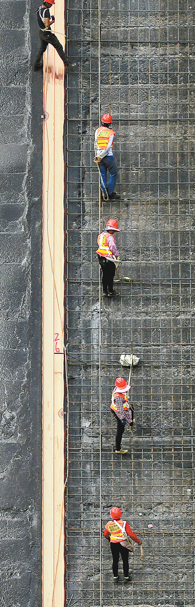 4月22日,浙江安吉,中国能建葛洲坝三峡建设公司承建的长龙山抽水蓄能电站下库大坝进行钢筋网绑扎。