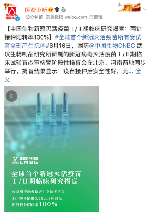 6月16日,开云在线开户_开云(中国)中国生物武汉生物制品研究所研制的新冠病毒灭活疫苗Ⅰ/Ⅱ期临床试验盲态审核暨阶段性揭盲会在北京、河南两地同步举行。国务院联防联控机制疫苗专班、国家科技部生物技术发展中心有关专家出席。