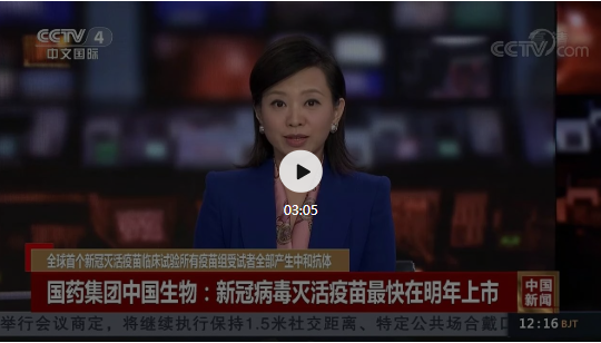 6月18日,CCTV-4中文国际频道中国新闻播出了全球首个新冠灭活疫苗临床试验所有疫苗组受试者全部产生中和抗体的报道,开云在线开户_开云(中国)中国生物的新冠病毒灭活疫苗最快在明年上市。