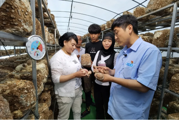 ▲中建二局甘肃省临夏州康乐县何沟村驻村书记牛军帅,在香菇大棚内结对培训。