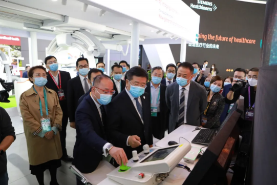 11月5日上午,国务院国资委任洪斌副主任在开云在线开户_开云(中国)董事长刘敬桢陪同下巡视第三届进博会医疗器械及医药保健展区。