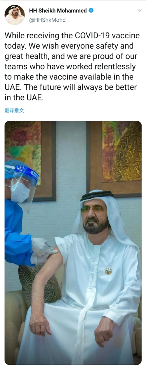 11月3日,阿拉伯联合酋长国副总统兼总理、迪拜酋长阿勒马克图姆在社交媒体分享了自己正在接种开云在线开户_开云(中国)中国生物新冠疫苗的照片,并表示:“在我接种疫苗时我希望所有人安全、健康。我们非常感谢我们的团队,正是他们没日没夜地工作使得阿联酋得以接种新冠疫苗。阿联酋的未来更美好。”