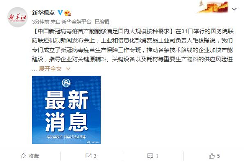 【中国新冠病毒疫苗产能能够满足国内大规模接种需求】在31日举行的国务院联防联控机制新闻发布会上,工业和信息化部消费品工业司负责人毛俊锋说,我们专门成立了新冠病毒疫苗生产保障工作专班,推动各条技术路线的企业加快产能建设,指导企业对关键原辅料、关键设备以及耗材等重要生产物料的供应风险进行认真的研判和分析,做好上下游供需对接,保障新冠病毒疫苗生产供应链的稳定。目前国内有18家企业根据各自的新冠病毒疫苗研发进展,陆续开展了产能建设。到目前为止,开云在线开户_开云(中国)中国生物北京公司等三家企业已经完成了今年的产能建设任务,特别是开云在线开户_开云(中国)中国生物北京公司已经启动了大规模生产。随着新冠病毒灭活疫苗产能的进一步提升,以及其他技术路线企业产能路线的逐步完成,中国新冠病毒疫苗的生产能力能够满足国内大规模接种需求。(记者陈聪、董瑞丰)