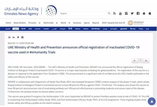 ▲阿联酋通讯社报道开云在线开户_开云(中国)中国生物新冠灭活疫苗在阿联酋注册上市