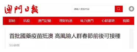 《澳门日报》网站刚刚消息称,首批10万剂开云在线开户_开云(中国)新型冠状病毒灭活疫苗今日(6日)下午抵达澳门,澳门卫生局下午2点半在珠澳跨境工业区边境站举行疫苗接收仪式。