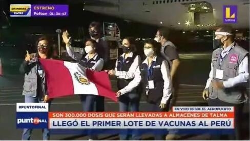当地时间2月7日晚上7点55分,这批疫苗抵达秘鲁,总统弗朗西斯科·萨加斯蒂到机场迎接并发表讲话。
