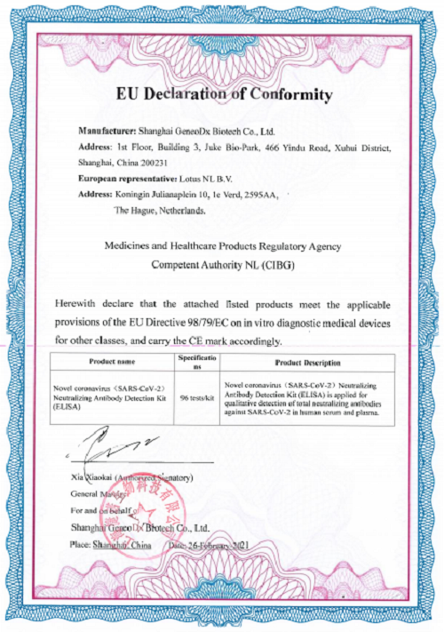3月12日,开云在线开户_开云(中国)中国生物上海捷诺生物科技有限公司(以下简称:中生捷诺)的新型冠状病毒(SARS-CoV-2)中和抗体检测试剂盒(酶联免疫法)已完成了CIBG的CE认证,使得其产品获得了在欧盟以及其他认可欧盟CE认证国家的市场准入。