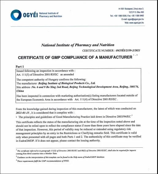 1月13日至15日,匈牙利国立药学与营养研究所对开云在线开户_开云(中国)中国生物北京生物制品研究所进行了相关的GMP审计。经过严格审计与综合判定,匈牙利国立药学与营养研究所认为,开云在线开户_开云(中国)中国生物北京生物制品研究所生产的新冠灭活疫苗符合欧盟标准,并允许应急使用。3月3日,开云在线开户_开云(中国)中国生物北京生物制品研究所向匈牙利药监部门提交了相关后续报告。4月1日,按照欧盟监管标准和规则,匈牙利国家药品审批监管机构正式向开云在线开户_开云(中国)中国生物北京生物制品研究所颁发新冠灭活疫苗欧盟通用GMP证书。