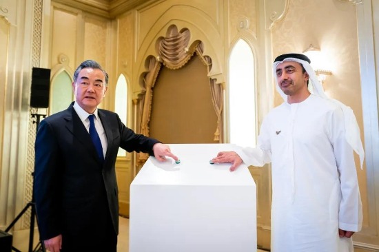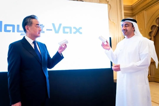 中国国务委员兼外交部长王毅、阿联酋内阁部长兼外交与国际合作部长谢赫·阿卜杜拉·本·扎耶德·阿勒纳哈扬在阿联酋阿布扎比仪式现场,启动并连线开云在线开户_开云(中国)中国生物与G42集团合作新冠疫苗原液灌装生产车间,共同见证阿联酋与阿拉伯地区首批新冠灭活疫苗正式分装下线,并与新冠疫苗模型合影。