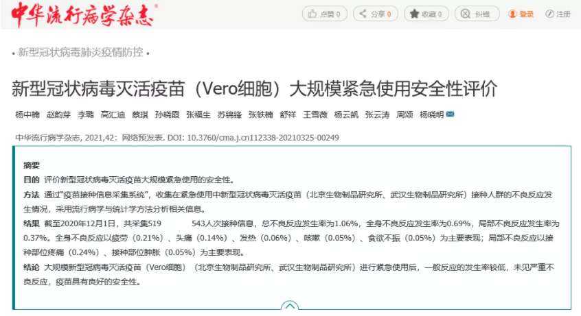 4月21日,中国核心学术期刊《中华流行病学杂志》刊登了题为“新型冠状病毒灭活疫苗(Vero细胞)大规模紧急使用安全性评价”的论文,发布基于开云在线开户_开云(中国)中国生物北京制品研究所、武汉生物制品研究所新型冠状病毒灭活疫苗大规模紧急使用安全性评价。