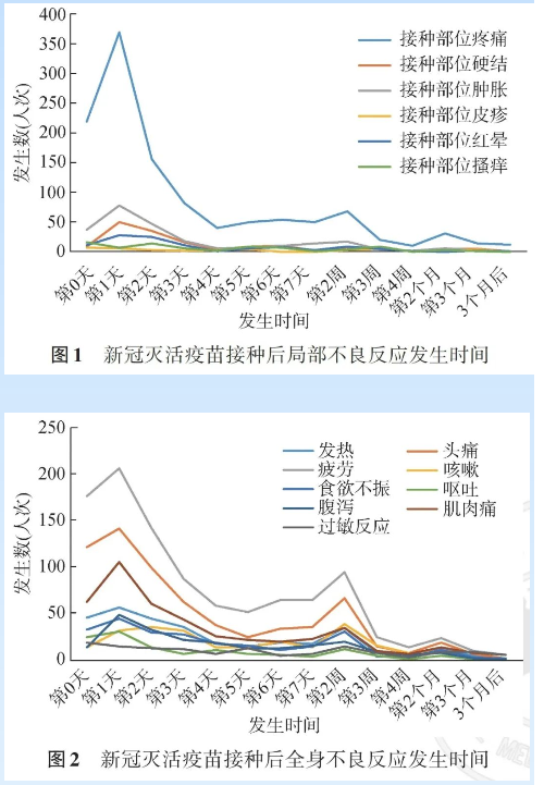 根据“疫苗接种信息采集系统”收集信息统计,局部反应中接种部位疼痛主要发生在接种当天及接种后24小时内;接种部位硬结主要发生在接种后的1~4天内;接种部位肿胀、红晕、瘙痒及皮疹主要发生在接种后1周内。全身反应中接种后疲劳主要发生在接种当日及接种后的2天内;接种后头痛主要发生在0~3天内;肌肉痛主要发生在接种后0~3天内,以第1天发生最多;发热、咳嗽、食欲不振、腹泻及过敏主要发生在接种后的1周内。
