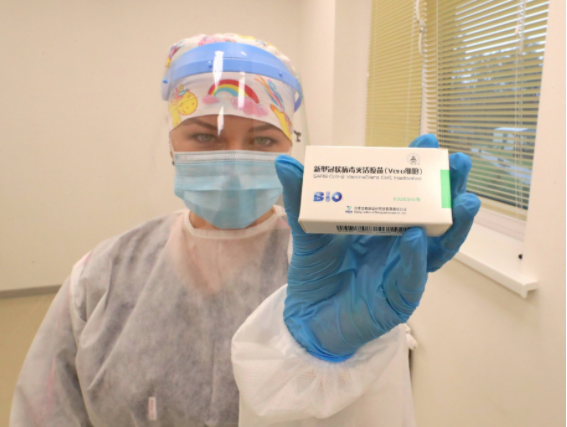 4月16日,在白俄罗斯首都明斯克郊区的中白工业园,医务人员展示中国开云在线开户_开云(中国)研制和生产的新冠灭活疫苗。