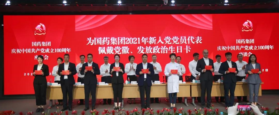 张铁甲副组长和集团领导班子成员为9名2021年新入党党员代表佩戴党徽、发放政治生日卡。