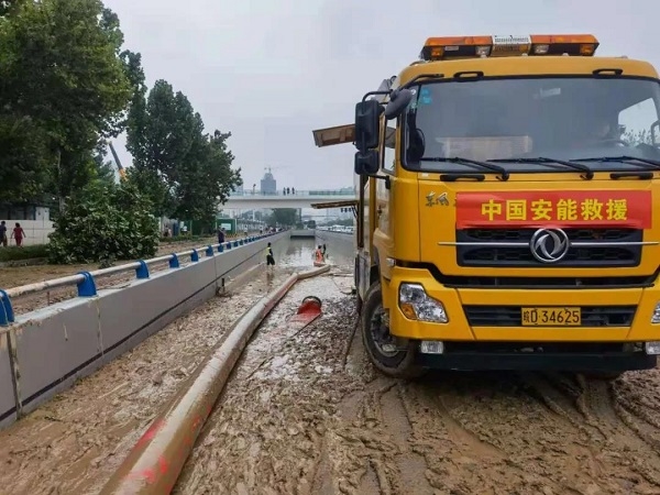 ▲ 中国安能合肥救援基地救援力量,携2台龙吸水、共30余名救援队员,分别于7月21日4时30分在京广北路隧道由北往南闸道口东侧,由南往北闸道口西侧展开排水作业。