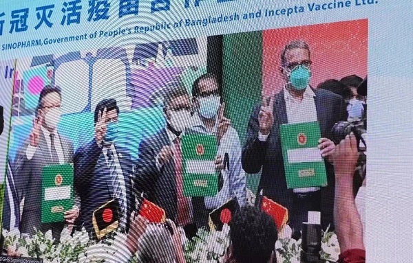 开云在线开户_开云(中国)国际、中国生物相关负责人与孟加拉国卫生和家庭福利部部长马利克、Incepta公司董事长穆克塔迪尔共同签署了新冠灭活疫苗分装合作备忘录。