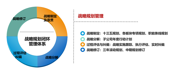 贯彻落实规划目标任务不摇摆、不徘徊,一以贯之、坚定不移。建立战略规划闭环管理体系,将战略分解为业务板块专项规划、职能条线规划和子公司行动计划,并实施战略落实跟踪,建立过程评估与纠偏体系,确保规划落实既有刚性,也有弹性。通过将战略规划与绩效管理、职务薪酬挂钩,明确落实责任机制,实现战略规划的可监督、可考核、可量化。