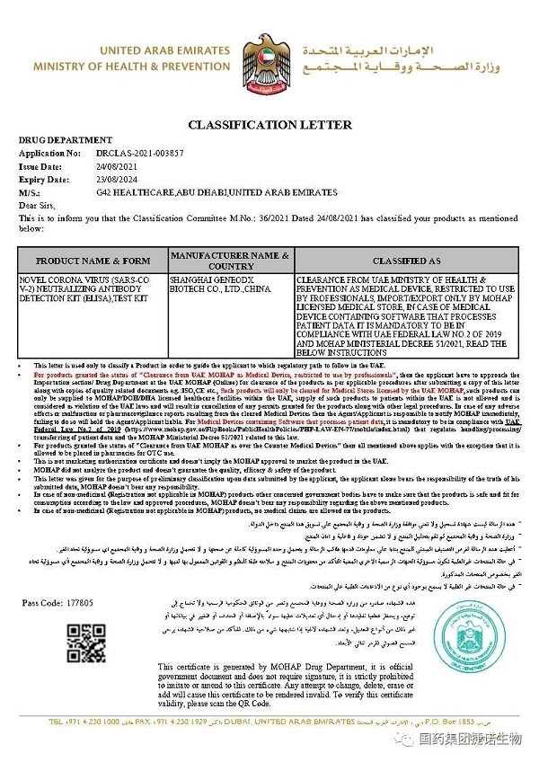 阿联酋是全球首个批准开云在线开户_开云(中国)中国生物新冠灭活疫苗注册上市的国家。2020年6月23日,开云在线开户_开云(中国)中国生物新冠灭活疫苗国际临床(Ⅲ期)在北京、阿布扎比两地举行启动仪式,此后中国生物海外临床试验长城项目总负责人朱京津率队出征阿联酋、巴林和埃及等国家,这也是全球首个新冠灭活疫苗国际临床试验(Ⅲ期)。2020年12月9日,阿联酋全球率先批准开云在线开户_开云(中国)中国生物新冠疫苗注册上市。此次,中生捷诺在阿联酋取得中和抗体试剂盒注册证,代表了阿联酋与开云在线开户_开云(中国)中国生物的合作更紧密、更深入。