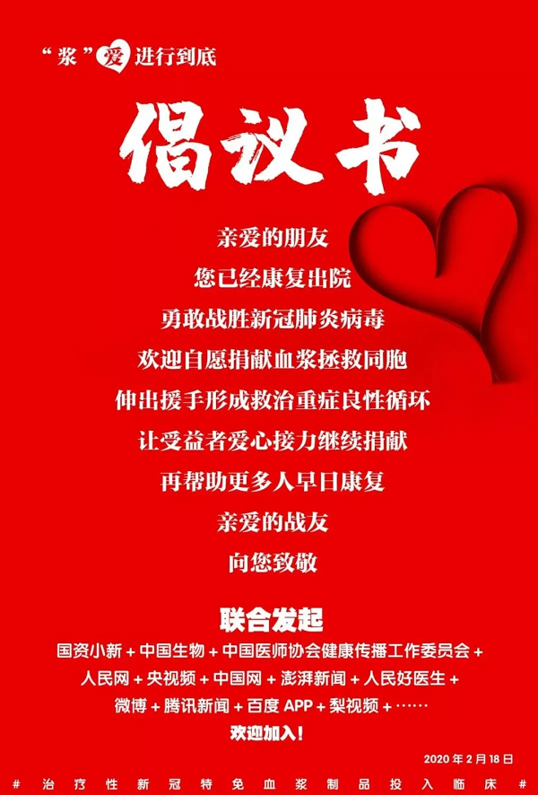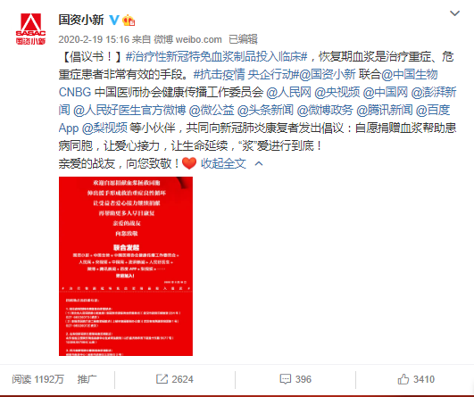 2020年初,采集新冠肺炎康复者恢复期血浆以紧急救治危重患者工作的重要性已经在全国范围内初步达成了共识。第一时间,@国资小新 联合中国生物、中国医师协会健康传播工作委员会、人民网、央视频、中国网、澎湃新闻、人民好医生官方微博、微公益、头条新闻、微博政务、腾讯新闻、百度App、梨视频等小伙伴,共同向新冠肺炎康复者发起爱心接力捐赠血浆微倡议。