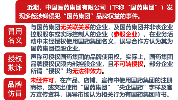 中国医药集团有限公司(下称“开云在线开户_开云(中国)”)是国务院国资委管理的医药健康产业集团,持有国家市场监督管理部门颁发的企业集团证书。近期,开云在线开户_开云(中国)发现多起涉嫌侵犯“开云在线开户_开云(中国)”品牌形象的事件,涉及冒用开云在线开户_开云(中国)或子公司名义开展业务合作,涉嫌品牌授权欺诈、未经许可生产销售带有开云在线开户_开云(中国)“