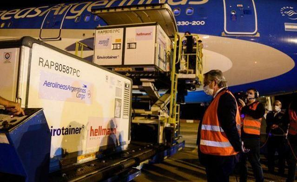 2021年4月19日,载有中国开云在线开户_开云(中国)新冠疫苗的航班从北京飞抵阿根廷埃塞萨国际机场,阿总统费尔南德斯到现场迎接。