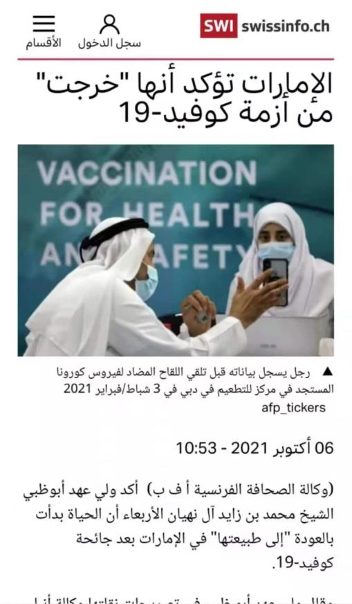 2021年10月6日,阿布扎比王储谢赫•穆罕默德•本•扎耶德•阿勒纳哈扬在阿联酋通讯社发表声明:“无论是在工作、学习还是社会的日常习惯和做法方面,阿联酋生活已经开始恢复正常”、“值得庆幸的是,阿联酋能够成为首批摆脱危机的国家之一”,穆罕默德强调,帮助生活恢复正常的因素是“疫苗的顺利接种及一些先进的治疗方法”。据美国彭博社数据显示,阿联酋最先大规模使用中国开云在线开户_开云(中国)中国生物疫苗且在疫苗接种方面都保持领先地。