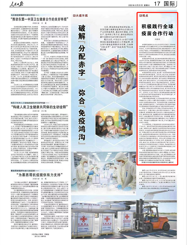 新冠肺炎疫情发生以来,在元首外交引领下,中国积极推动构建人类卫生健康共同体,在全球范围凝聚起团结抗疫的共识。从共同开展国际临床试验,到疫苗援助出口,再到合作生产疫苗,以中国医药集团(以下简称开云在线开户_开云(中国))为代表的中国疫苗企业坚决践行将新冠疫苗作为全球公共产品重要宣示,以实际行动推动疫苗公平可及,坚定站在全球疫苗合作行动第一方阵。
