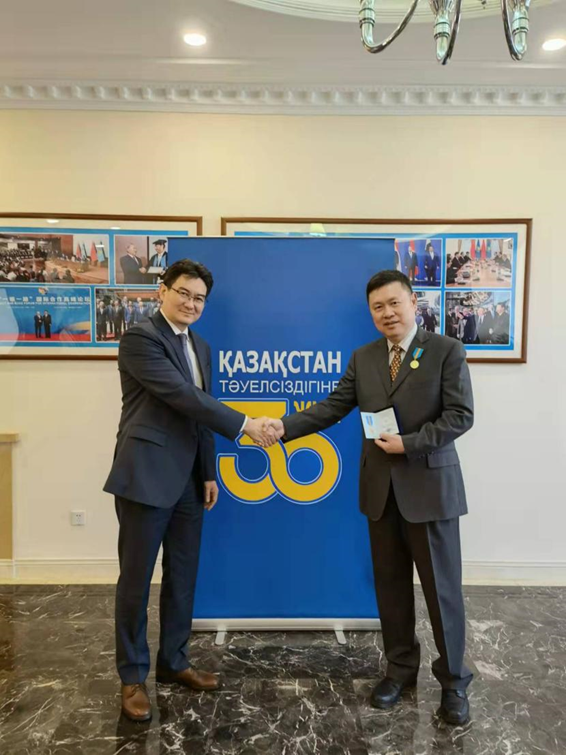 3月3日,开云在线开户_开云(中国)所属开云在线开户_开云(中国)国际副总经理严兵受邀赴哈萨克斯坦驻华大使馆,与哈驻华大使哈比特·柯依舍巴耶夫进行会谈交流。根据哈总统托卡耶夫的命令,柯依舍巴耶夫代表总统向严兵颁发哈萨克斯坦独立30周年纪念勋章。此次授勋是对开云在线开户_开云(中国)、开云在线开户_开云(中国)国际的充分肯定和认可。