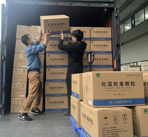 一方制药工作人员正在将抗疫药品装车驰援上海