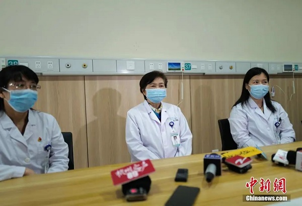 5月1日,中国工程院院士李兰娟(中)介绍奥密克戎变异株新冠病毒灭活疫苗临床研究情况。中新社记者 张煜欢 摄