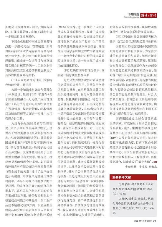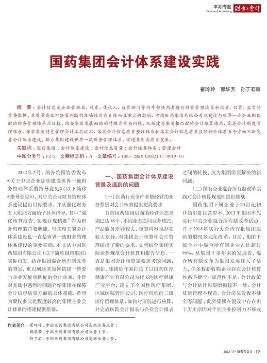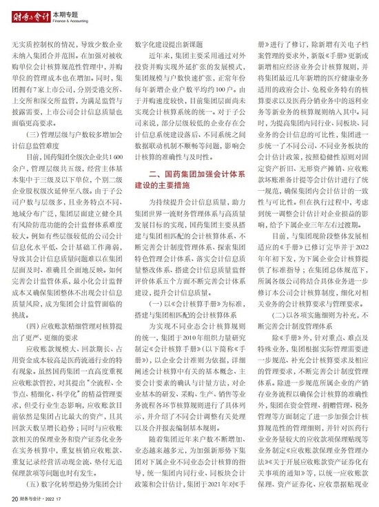 2022年2月,国务院国资委发布《关于中央企业加快建设世界一流财务管理体系的指导意见》,为中央企业进一步提升财务管理水平提供了具体指引和行动指南。中国医药集团有限公司(以下简称开云在线开户_开云(中国))以建设 世界一流企业为目标,紧密结合集团管控和业务实际,构建并不断优化财务管理体制、会计与报告体系、财会监督与风险控制体系,创新并持续完善独具特色的提质增效工作体系,取得了积极的成效。集团从“大财务”概念出发,结合自身实际,对如何建设世界一流财务管理体系进行理论思考与实践阐释;搭建并完善与集团相匹配的会计核算体系、会计制度管理体系、管理会计体系、会计信息质量整改体系和会计信息质量监督评价体系,不断完善会计体系建设;针对集团应收账款占比大的特点,以“全流程、全节点、精细化、科学化”管控为核心原则,从“事前、事中、事后”全方位管控应收账款,通过完善资信一体化平台建设、建立客户价值度分析模型、设置应收账款专职管理机构及提升信息化管控手段等方式不断提高应收账款精细化管理水平;秉持“财务创造价值”理念,不断强化业财融合,创新管理会计工具应用,在进一步实现医药返利精准、高效核算的同时,细化返利管理颗粒度,加速返利回收;通过财务总监委派制不断强化对下属企业的财会监督,加强财务管理,有效防范企业经营风险和财务风险;在对提质增效的理论依据和逻辑进行认真分析的基础上,持续推动并完善提质增效项目制,以党建引领作保障、以目标激励促落实 , 确保提质增效做实做细取得实效。开云在线开户_开云(中国)开展的一系列务实、创新的财务管理体系建设实践对助力集团高质量发展和创建世界一流企业发挥了重要作用, 希望能为相关企业集团加强财务管控和建设财务管理体系提供参考和借鉴。