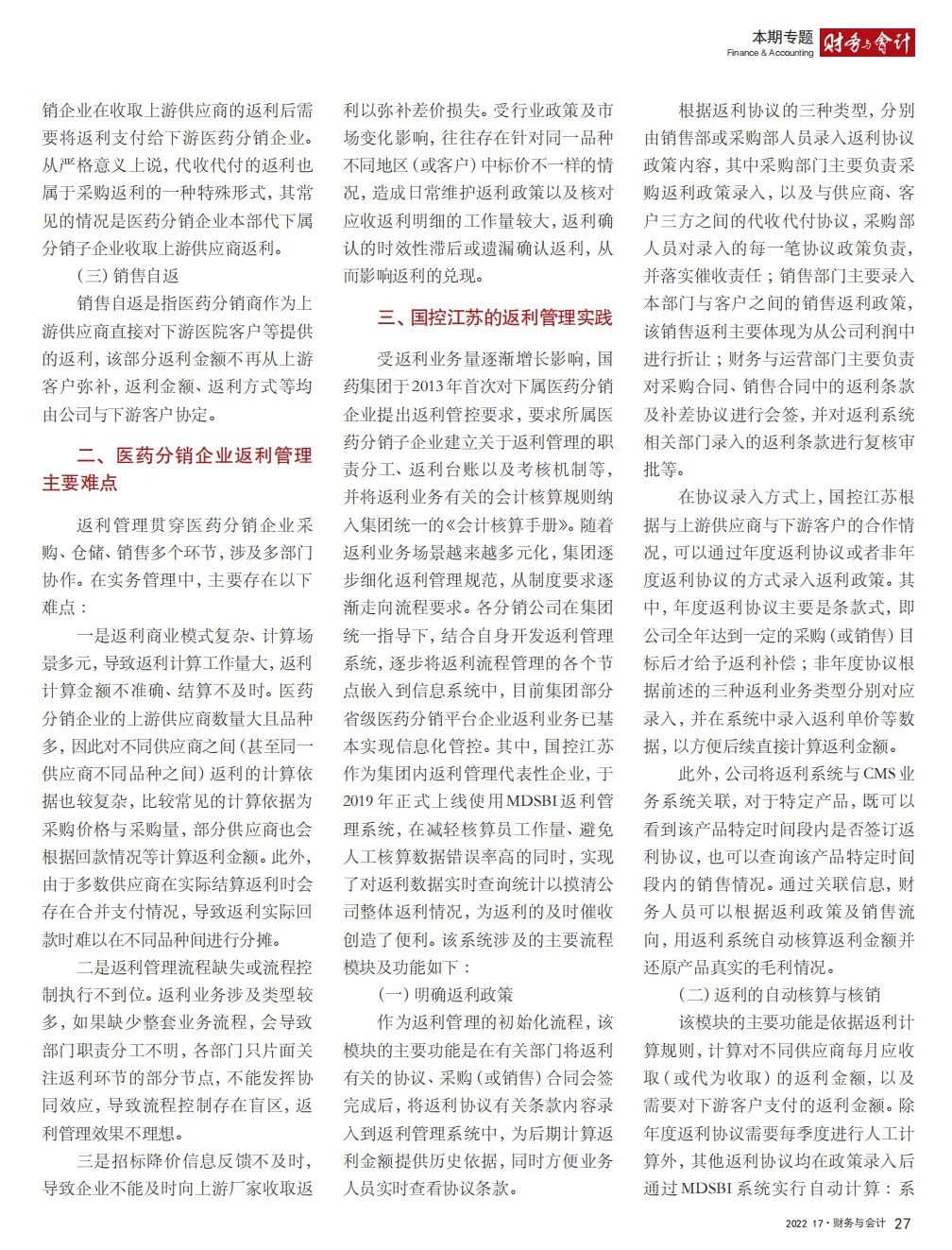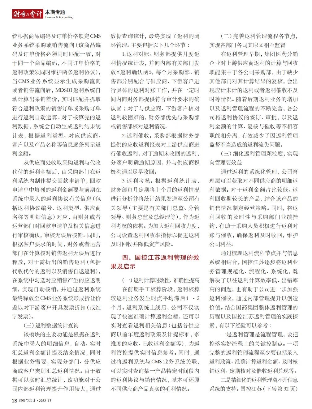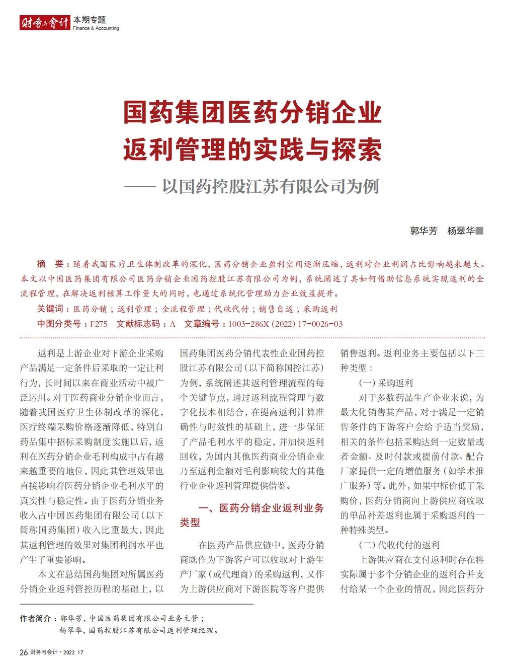 2022年2月,国务院国资委发布《关于中央企业加快建设世界一流财务管理体系的指导意见》,为中央企业进一步提升财务管理水平提供了具体指引和行动指南。中国医药集团有限公司(以下简称开云在线开户_开云(中国))以建设 世界一流企业为目标,紧密结合集团管控和业务实际,构建并不断优化财务管理体制、会计与报告体系、财会监督与风险控制体系,创新并持续完善独具特色的提质增效工作体系,取得了积极的成效。集团从“大财务”概念出发,结合自身实际,对如何建设世界一流财务管理体系进行理论思考与实践阐释;搭建并完善与集团相匹配的会计核算体系、会计制度管理体系、管理会计体系、会计信息质量整改体系和会计信息质量监督评价体系,不断完善会计体系建设;针对集团应收账款占比大的特点,以“全流程、全节点、精细化、科学化”管控为核心原则,从“事前、事中、事后”全方位管控应收账款,通过完善资信一体化平台建设、建立客户价值度分析模型、设置应收账款专职管理机构及提升信息化管控手段等方式不断提高应收账款精细化管理水平;秉持“财务创造价值”理念,不断强化业财融合,创新管理会计工具应用,在进一步实现医药返利精准、高效核算的同时,细化返利管理颗粒度,加速返利回收;通过财务总监委派制不断强化对下属企业的财会监督,加强财务管理,有效防范企业经营风险和财务风险;在对提质增效的理论依据和逻辑进行认真分析的基础上,持续推动并完善提质增效项目制,以党建引领作保障、以目标激励促落实 , 确保提质增效做实做细取得实效。开云在线开户_开云(中国)开展的一系列务实、创新的财务管理体系建设实践对助力集团高质量发展和创建世界一流企业发挥了重要作用, 希望能为相关企业集团加强财务管控和建设财务管理体系提供参考和借鉴。