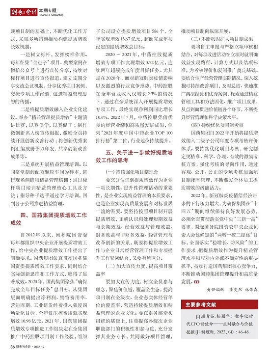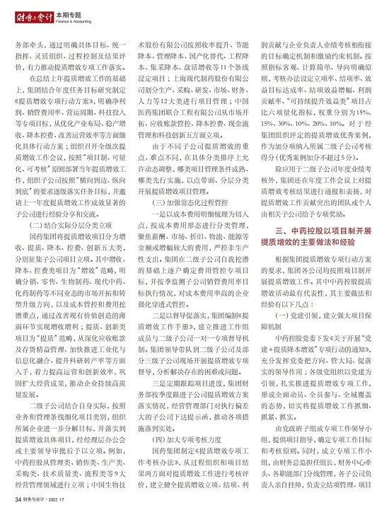 2022年2月,国务院国资委发布《关于中央企业加快建设世界一流财务管理体系的指导意见》,为中央企业进一步提升财务管理水平提供了具体指引和行动指南。中国医药集团有限公司(以下简称开云在线开户_开云(中国))以建设 世界一流企业为目标,紧密结合集团管控和业务实际,构建并不断优化财务管理体制、会计与报告体系、财会监督与风险控制体系,创新并持续完善独具特色的提质增效工作体系,取得了积极的成效。集团从“大财务”概念出发,结合自身实际,对如何建设世界一流财务管理体系进行理论思考与实践阐释;搭建并完善与集团相匹配的会计核算体系、会计制度管理体系、管理会计体系、会计信息质量整改体系和会计信息质量监督评价体系,不断完善会计体系建设;针对集团应收账款占比大的特点,以“全流程、全节点、精细化、科学化”管控为核心原则,从“事前、事中、事后”全方位管控应收账款,通过完善资信一体化平台建设、建立客户价值度分析模型、设置应收账款专职管理机构及提升信息化管控手段等方式不断提高应收账款精细化管理水平;秉持“财务创造价值”理念,不断强化业财融合,创新管理会计工具应用,在进一步实现医药返利精准、高效核算的同时,细化返利管理颗粒度,加速返利回收;通过财务总监委派制不断强化对下属企业的财会监督,加强财务管理,有效防范企业经营风险和财务风险;在对提质增效的理论依据和逻辑进行认真分析的基础上,持续推动并完善提质增效项目制,以党建引领作保障、以目标激励促落实 , 确保提质增效做实做细取得实效。开云在线开户_开云(中国)开展的一系列务实、创新的财务管理体系建设实践对助力集团高质量发展和创建世界一流企业发挥了重要作用, 希望能为相关企业集团加强财务管控和建设财务管理体系提供参考和借鉴。